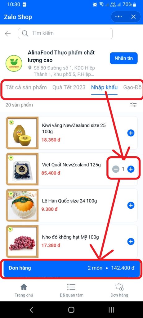 1.2. Quý khách vào mục “Sản phẩm” trên menu AlinaFood ZaloOA và chọn các sản phẩm, số lượng cần mua (dùng các nút + hoặc – để tăng giảm số lượng). Do quy định của Zalo, số lượng không có phần lẻ thập phân nên các sản phẩm có đơn vị tính là kg sẽ được tính theo từng 100g (ví dụ: 0,4kg Lê Hàn Quốc sẽ nhập số lượng là 4).