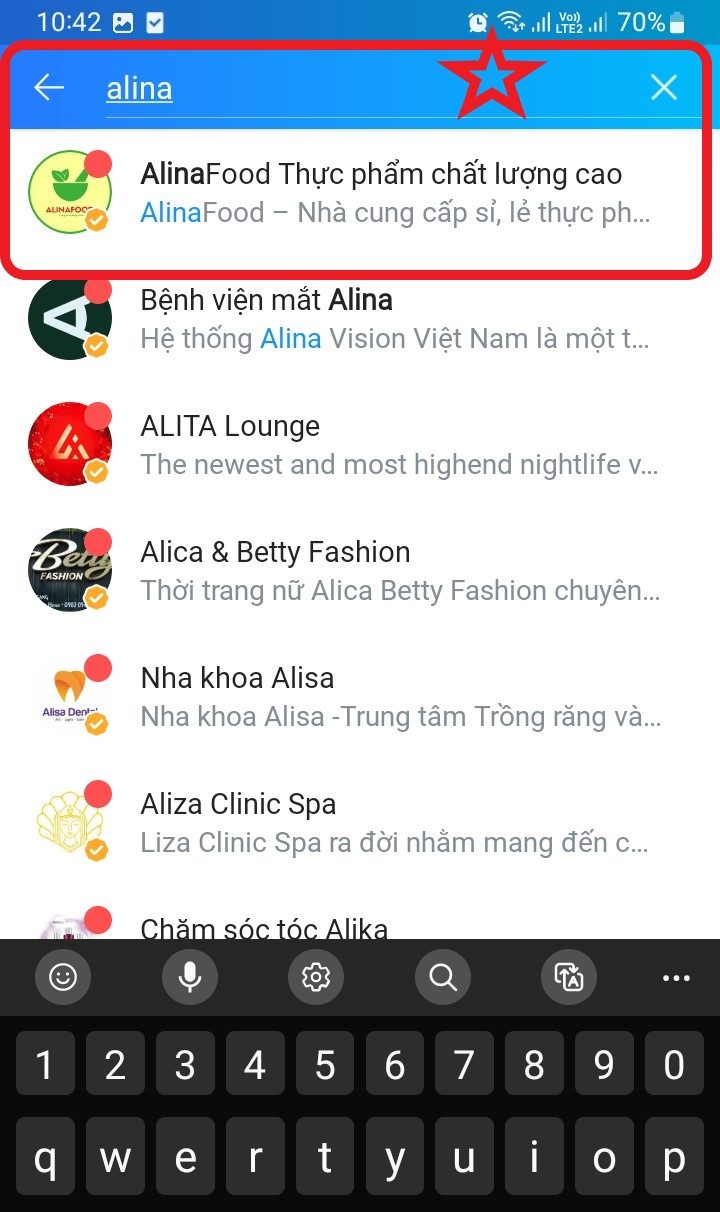 1.1. Tìm trang AlinaFood ZaloOA (Nếu Quý khách chưa từng có kết nối với AlinaFood)
