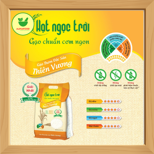 Gạo thơm đặc sản Thiên Vương có hạt thon dài mảnh mai, cơm có vị đậm, ngọt của gạo và độ mềm, dẻo, không dính hòa quyện với sự kết tinh tinh tế giữa hương lài và hương lá dứa (lá nếp) của hai giống gạo lừng danh Lộc Trời 28 và Basmati.